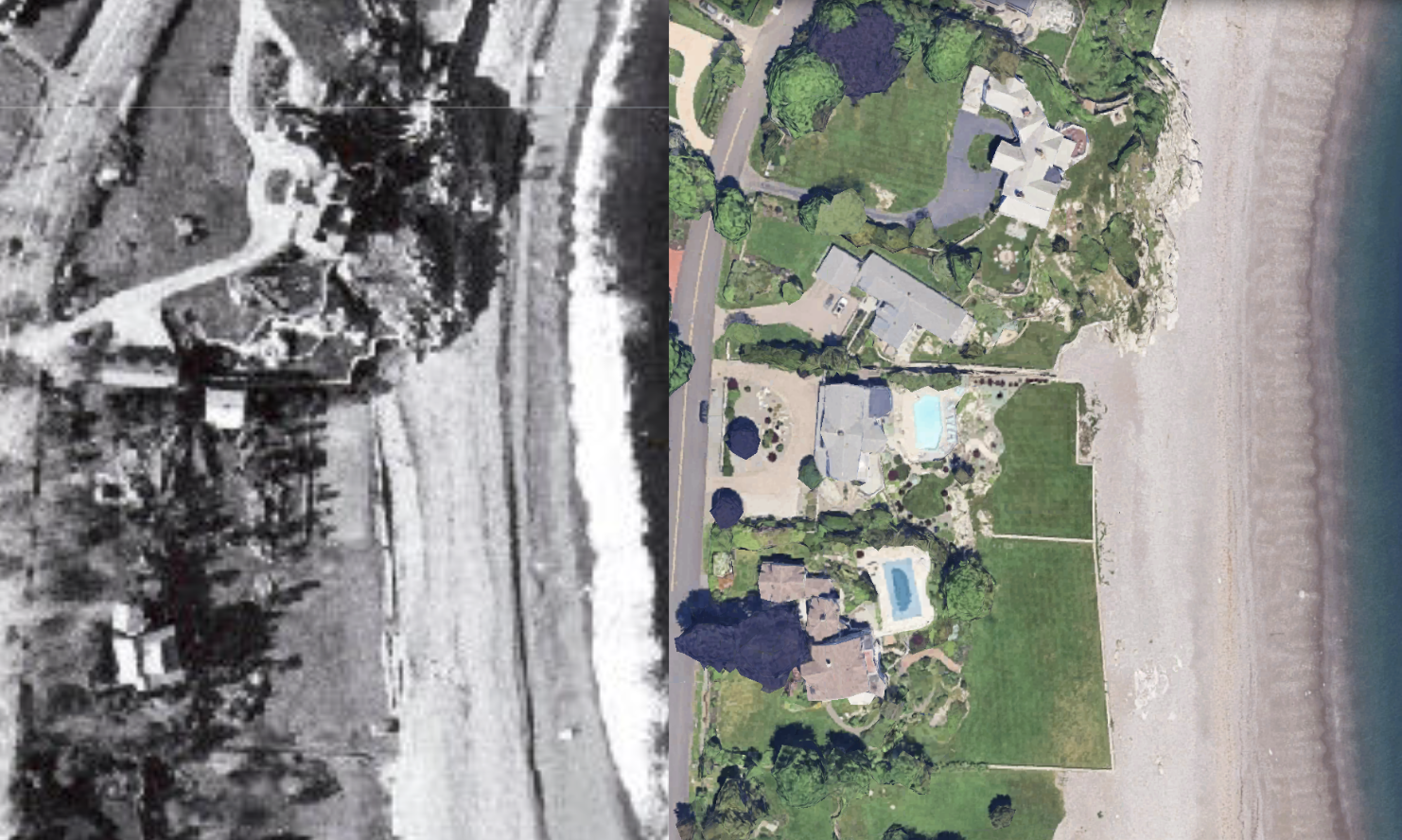 To orient myself throughout the following maps, I used the recently demolished Sky High, the former estate of felt manufacturer and race car driver herbet bowden, just north of Seagard, built in the 1890s. This allowed me to locate the home in question at the bottom of the following 1954 satellite photograph, further confirming the home's resemblance to the current structure.