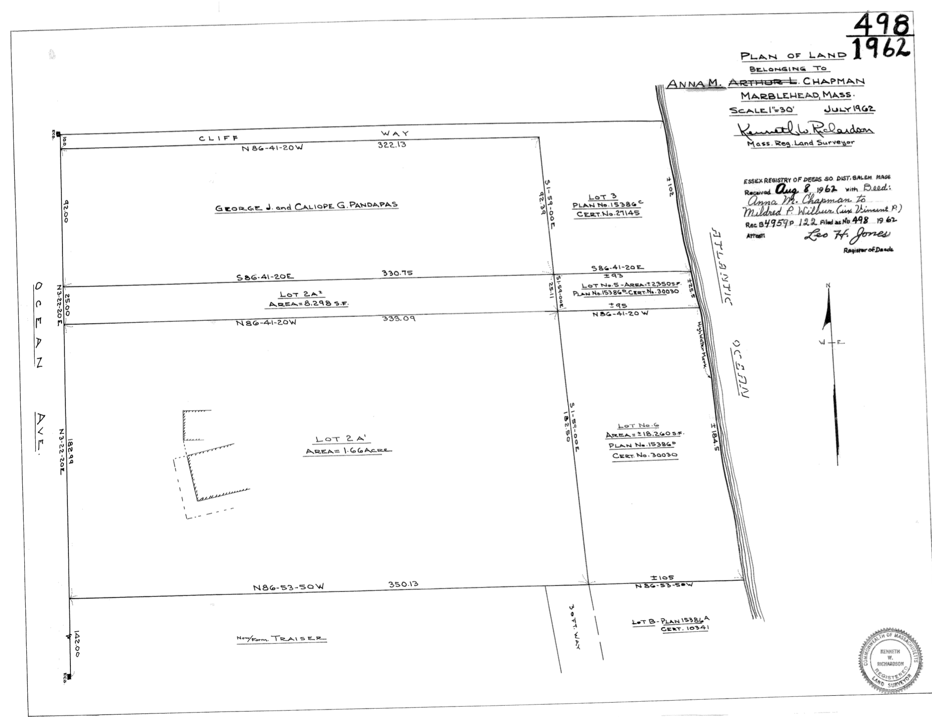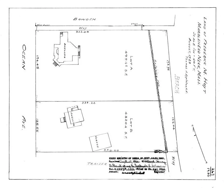 To view the entire Hoyt property, I turned to a 1912 Atlas of Marblehead, which, through its proximity to Sky High, indicated that Mirrmar had stood at 353 Ocean Ave, which was cleared in 1955 to make way for new construction. Yet the spot where Seagard stands today, just above the Hoyt garage, was vacant.