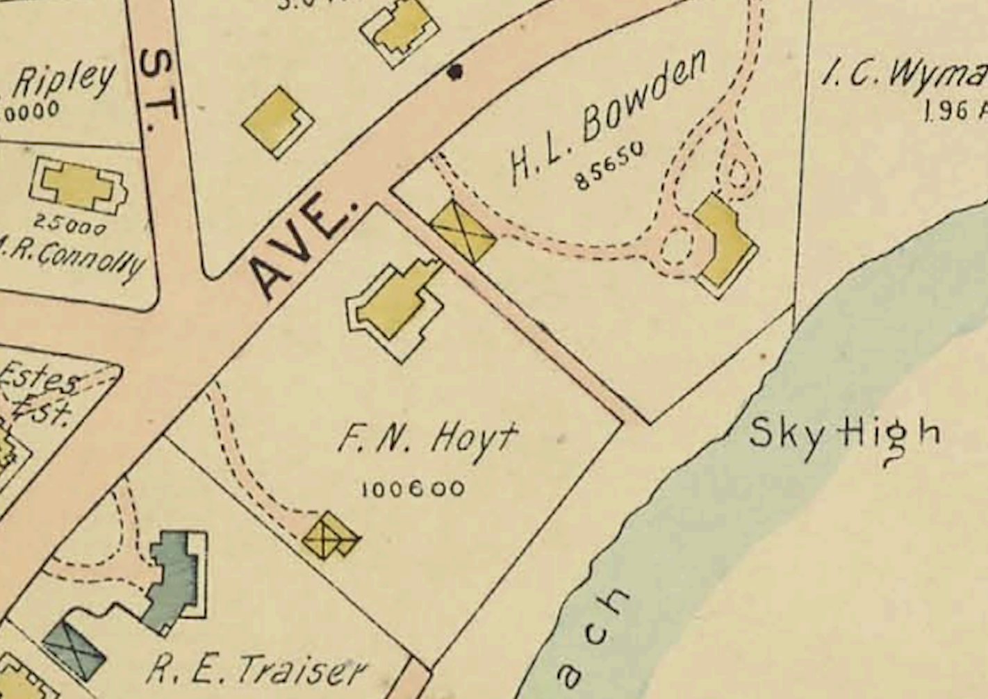I then sought out the earliest Sandborn fire map of the area, circa 1915, on which the home immediately south of Sky High is labeled “Mirrmar” and ascribed to F.M. Hoyt. I recognized the name Hoyt immediately, as the family which traces its roots to the arrival of Englishman Simon Hoyt in 1630 is pervasive in the historical record of the northeast. In fact, there are well-known Hoyt estates throughout New York and New England, one of which, “The Point”, now abandoned, will be the subject of a later article.