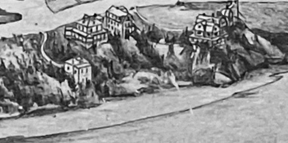 To confirm the home's absence, I next consulted a 1909 panoramic view of Marblehead, the oldest such map to depict structures in the area of interest. It showed two buildings that closely resembled the 1915 Sanborn floor plan for Miramar and its garage, but there was still no indication of Seagard.